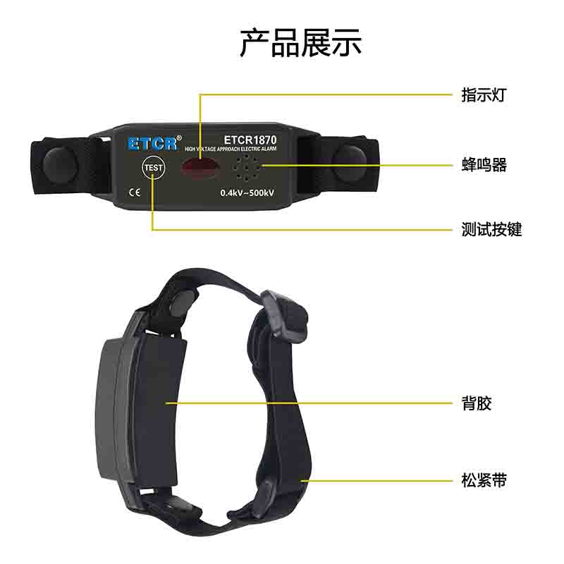 ETCR1870手臂式近電報警器又稱穿戴式近電報警器,為近電作業人員提供一款安全、實用、便捷的新型高壓報警裝置。帶電作業時,操作人員與帶電體的安全距離不能低于相關工作規程的要求。作業人員佩戴本報警器后,在接近高壓帶電體一定距離時,根據電壓等級相應的安全距離,報警器發出聲光報警,提醒電氣工作人員注意安全,避免發生高壓觸電事故。