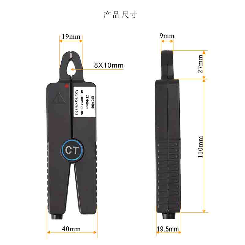 ETCR008V (電壓型) | ![]() | 量程:0.00mA~30A AC 精度等級:1.0 相位誤差:≤2° 變比:1A/100mV 工作頻率:10Hz~100kHz | Ф8mm | 137mm×40mm×19.5mm | 175g | |