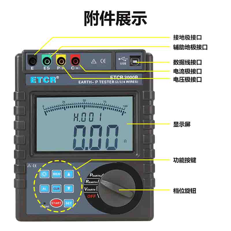 | ETCR3000B接地電阻/土壤電阻率測試儀 | 0.00Ω~30.00kΩ | 0.00Ωm~9999kΩm | AC 0V~600V | 可設(shè)置報警閾值 | 300組 | —— |