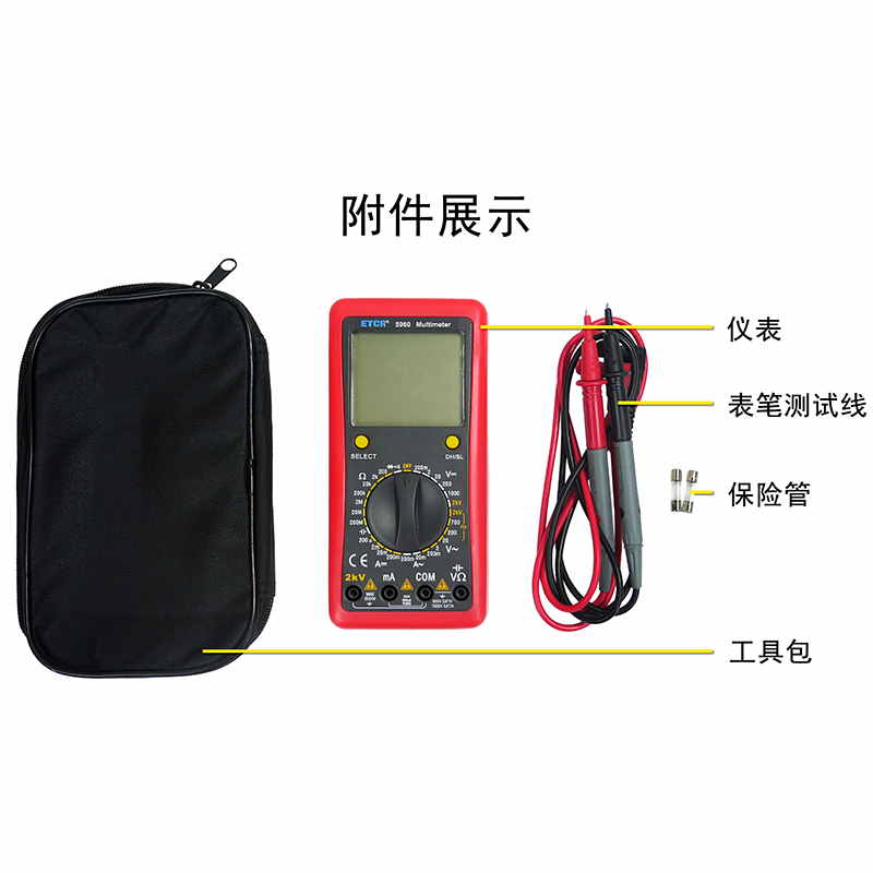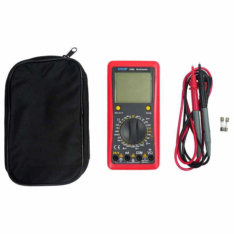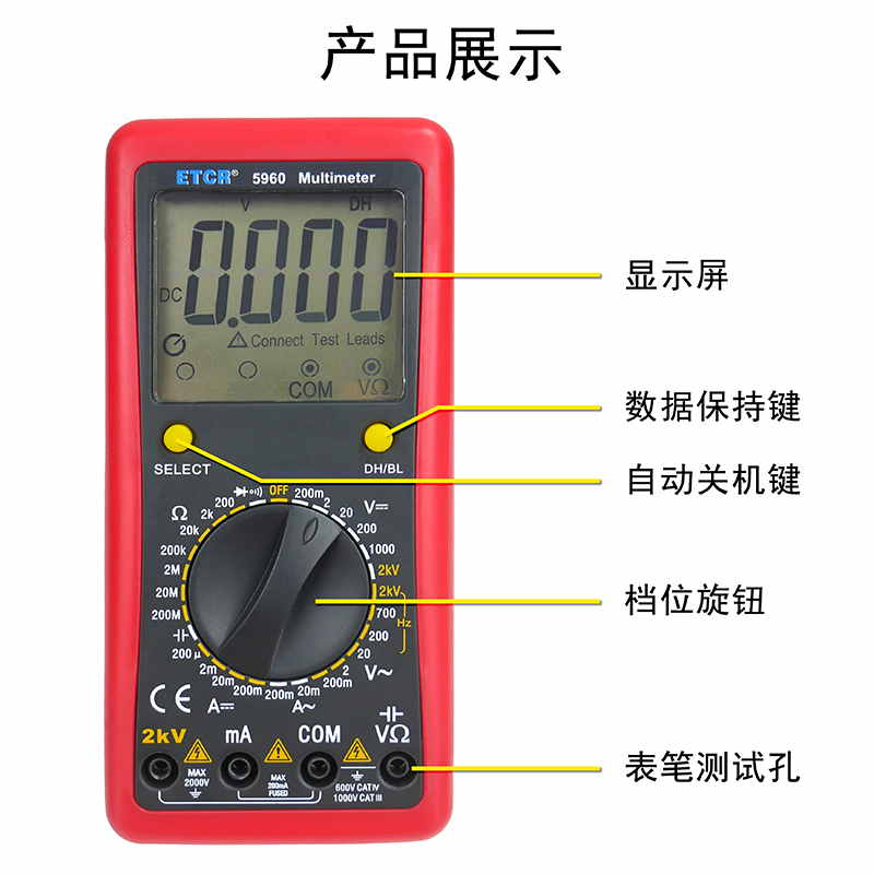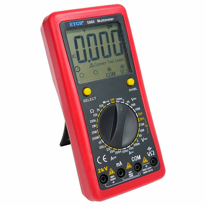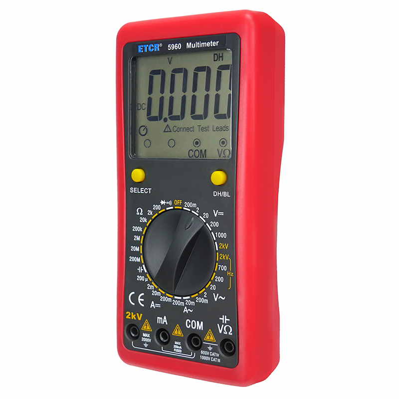ETCR5960數(shù)字萬用表又稱數(shù)字萬能表、智能萬用表,是一種性能穩(wěn)定、用電池供電的高可靠性數(shù)字萬用表,它用單片機(jī)管理,全功能有過載保護(hù)。儀表能顯示各檔表筆和插座應(yīng)插的位置,提示您不要插錯(cuò)位置。該儀表能測(cè)量直流電壓和電流、交流真有效值電壓和電流、電阻、電容、二極管正向壓降、電路通斷等。測(cè)量準(zhǔn)確、性能穩(wěn)定、安全可靠,是您理想的測(cè)試維修工具!