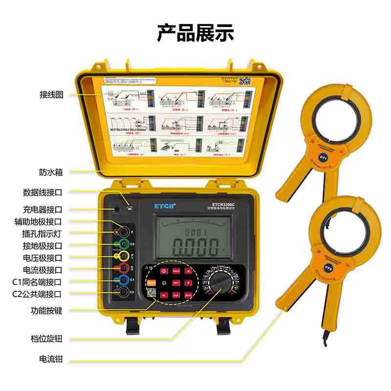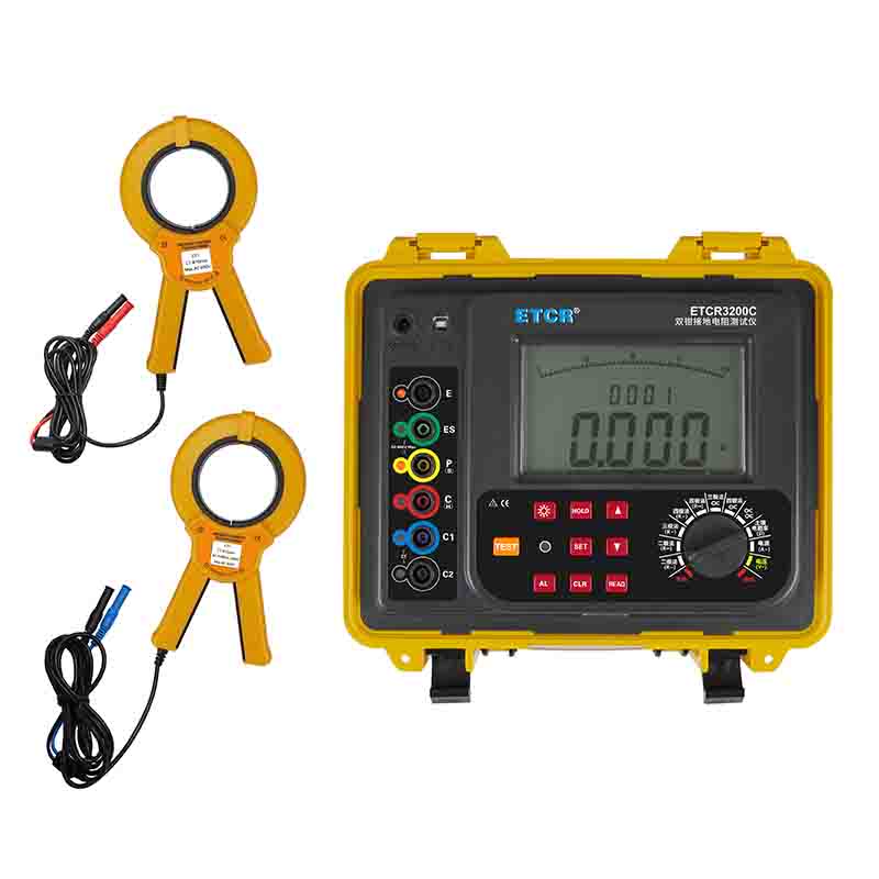ETCR3200C雙鉗接地電阻測試儀,由主機(jī)、電流鉗(雙鉗)、數(shù)據(jù)軟件、測試線、輔助接地棒、通訊線等組成。儀表采用大口徑電流鉗設(shè)計(jì),可應(yīng)對各種場合的測試需求,可測量大尺寸接地引下線的接地電阻值,主機(jī)超大LCD顯示,具有背光、棒圖指示,一目了然。儀表具有支持安卓系統(tǒng)的藍(lán)牙通訊功能,安裝APP后可在移動(dòng)終端進(jìn)行測試或讀取測試記錄,給你帶來全新體驗(yàn)。儀表具有存儲(chǔ)功能,時(shí)鐘功能,自動(dòng)存儲(chǔ)含有日期時(shí)間的測試結(jié)果2000組。通過USB接口數(shù)據(jù)軟件可以實(shí)現(xiàn)歷史數(shù)據(jù)讀取、查閱、保存、報(bào)表、打印等功能。