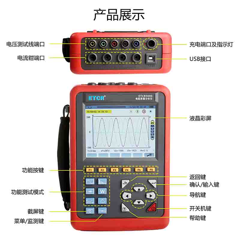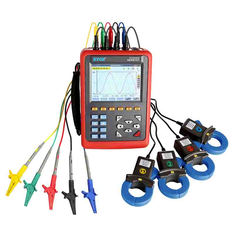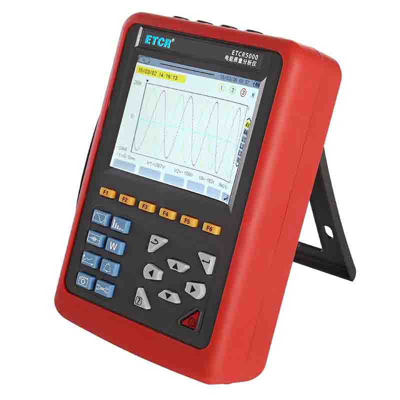ETCR5000電能質量分析儀又稱電力質量分析儀、電力參數測試儀、諧波分析儀,是一款專為現場測試三相電能參數的多功能、智能化綜合型測試儀器??赏瑫r測量4路電流(ABC三相及中性線電流),4路電壓(ABC三相電壓及中性線對地電壓)、電流電壓的峰值、一段時間內的最大最小值、三相不平衡度、短時電壓閃變、變壓器K因數、有功功率、無功功率、視在功率、功率因數、位移功率因數、有功電能、無功電能、視在電能、諧波比、總諧波失真度等;顯示電流電壓的實時波形、相量圖、諧波比柱形圖;動態捕捉電壓電流瞬時變化,監測啟動電流,監測各電力參數并生成告警列表,長時間記錄測試數據并生成趨勢曲線圖等功能。適用于電力、石化、冶金、鐵路、工礦企業、科研院校、計量部門等。