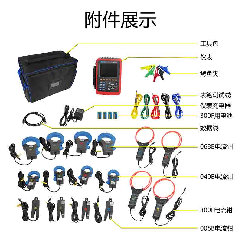 | 電流鉗規格(選配) | 008B尖小形電流鉗:Φ8mm 040B圓口形電流鉗:35mm×40mm; 068B圓口形電流鉗:68mm×68mm 300F柔性線圈電流傳感器:Φ300mm |