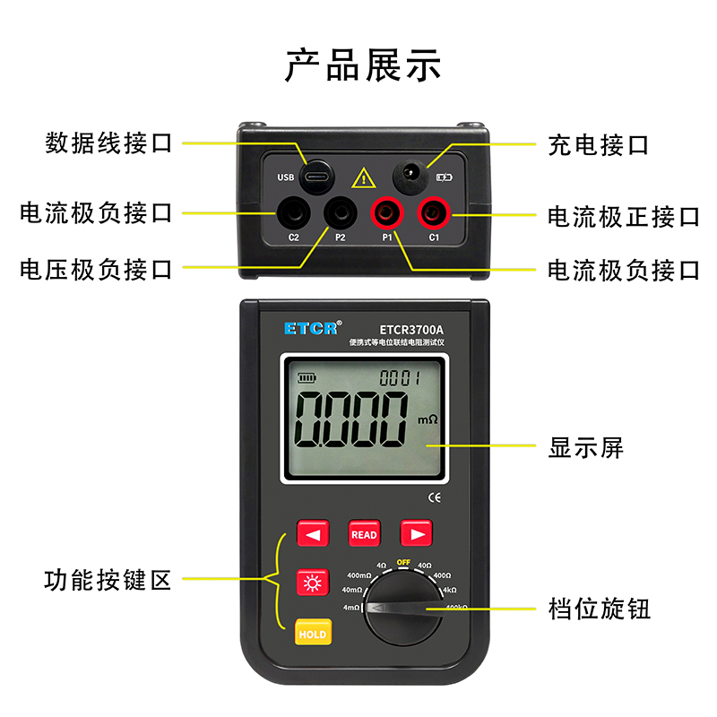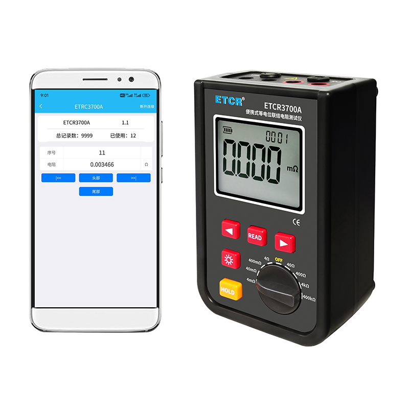 | ETCR3700A便攜式等電位聯(lián)結(jié)電阻測試儀 | 0.001mΩ~40.0kΩ | 4mΩ、40mΩ、400mΩ、4Ω、40Ω、400Ω、4kΩ、400kΩ | 1.2A MAX | —— | 9999組 | 藍(lán)牙、USB |