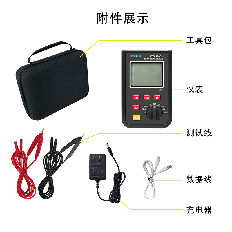 隨機(jī)附件 | 測試儀:1件;測試線:4條;USB通訊線:1條;專用充電器:1件;工具包:1件;表筆:2支 | |||