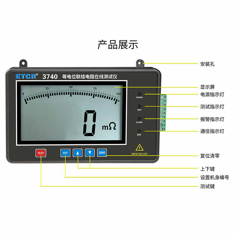 ETCR3740等電位聯結電阻在線監測儀采用微處理機技術,四線法測試,安全精密可靠,測試儀提供485通訊或4G通訊方式,用戶可根據MODBUS通訊協議進行二次開發、組建網絡、實現遠程多點在線監測。測試儀采用大屏LCD顯示,可設置測試參數,在現場查看當前直流電阻值。儀表具有聲光報警功能,可設置報警臨界值。測試儀安裝簡單,結構緊湊,安全耐用。