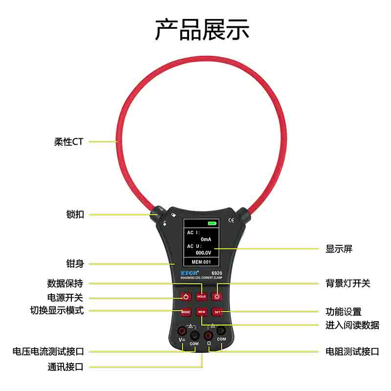 ETCR6920柔性電流鉗表又名柔性線圈鉗表、超大電流鉗表、羅氏線圈電流鉗表、洛氏線圈電流鉗表,用于交流電流測試、電壓測試、電阻測試、通斷測試。柔性線圈無任何裸露金屬導(dǎo)體,體積小、重量輕、柔軟靈活,特別適合大尺寸導(dǎo)體、狹窄環(huán)境和排線密集的場所,可用于信號嚴(yán)重畸變的工業(yè)環(huán)境電流測試。廣泛適用于電力、通信、氣象、鐵路、油田、建筑、計量、科研教學(xué)單位、工礦企業(yè)等領(lǐng)域。