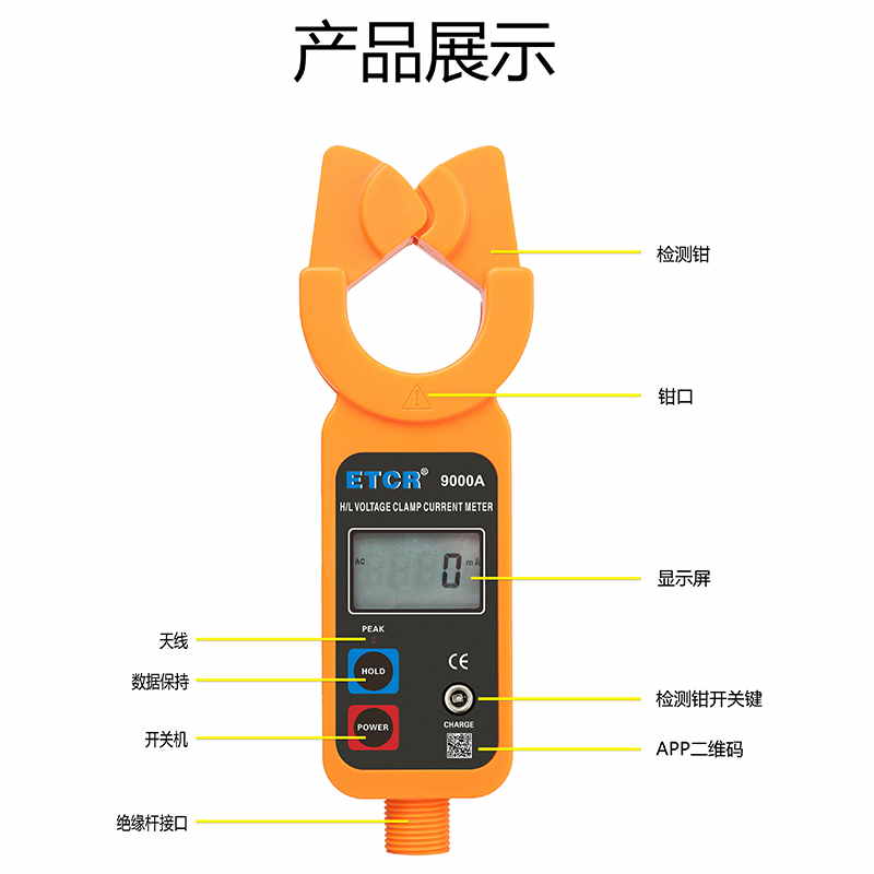 ETCR9000A藍牙版高低壓鉗形電流表鉗頭與引導區創新的一體化設計,通過按壓或退拔絕緣桿能快速方便鉗夾或撤離被測導線,安全快捷。儀表還具有峰值保持、數據保持、數據存儲、藍牙通訊等功能。