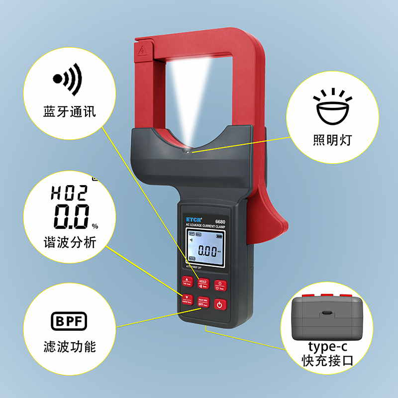 ETCR6680鉗形漏電流表可測試40Hz~1kHz頻率范圍的電流。鉗表還具有背光、手電筒、數(shù)據(jù)存儲(chǔ)、藍(lán)牙通訊等功能。鉗表使用大容量鋰電池type-c充電口,是一款新型的電工安全檢測必備工具。