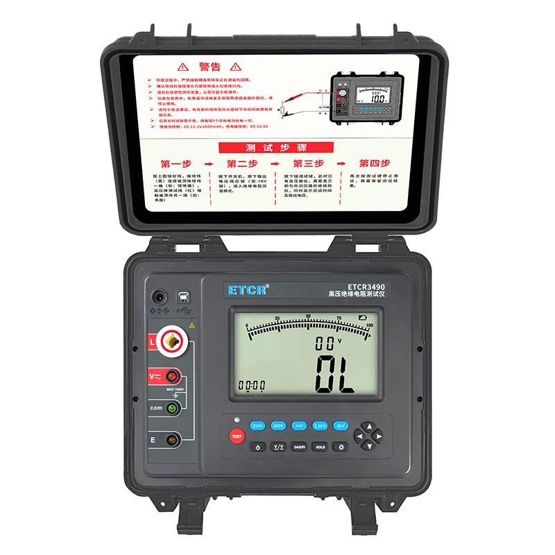 ETCR3490系列高壓絕緣電阻測試儀又名兆歐表、絕緣電阻測試儀等,用于絕緣電阻的測試。本儀表是一款高性能數字式儀表,具有LCD大屏幕帶背光顯示、數據保持、自動放電、自動關機等功能。儀表具有測試計時,電壓監測功能,回路電壓大于36V時,儀表將禁止測試以保護被測物及人員安全。儀表功能操作簡易,絕緣電阻值,測試時間,輸出電壓同屏顯示,同時還具備吸收比、極化指數測試、交流電壓、直流電壓測試功能。