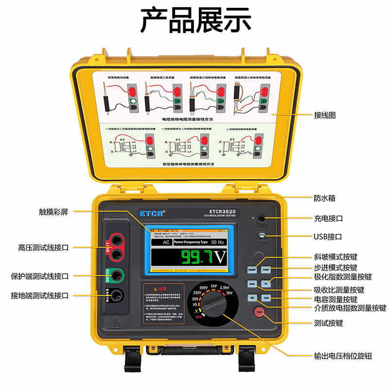 ETCR3520高壓絕緣電阻測試儀又稱高壓兆歐表、高壓絕緣電阻表,儀表擁有完善的各種絕緣電阻指標(biāo)測試功能、自設(shè)測試電壓功能、良好的抗干擾能力,在變電站等有強(qiáng)感應(yīng)電環(huán)境下、以及在分布電容較大的使用場景下具有明顯優(yōu)勢。儀表采用真彩觸摸屏,所有測試數(shù)據(jù)及電池電量同屏顯示一目了然,旋鈕開關(guān)和按鍵組合使得操作非常簡單。用戶無需費(fèi)力記憶操作方法,點(diǎn)擊屏幕的“HELP”即可彈出操作方法,有效指引用戶操作儀表。產(chǎn)品適用于大容量、高壓、強(qiáng)感應(yīng)電環(huán)境下電氣設(shè)備、輸電線路等大型設(shè)備的絕緣電阻測試。是電力、電信、氣象、機(jī)房、油田、機(jī)電安裝和維修以及工礦企業(yè)供電部門常用而必不可少的儀表。