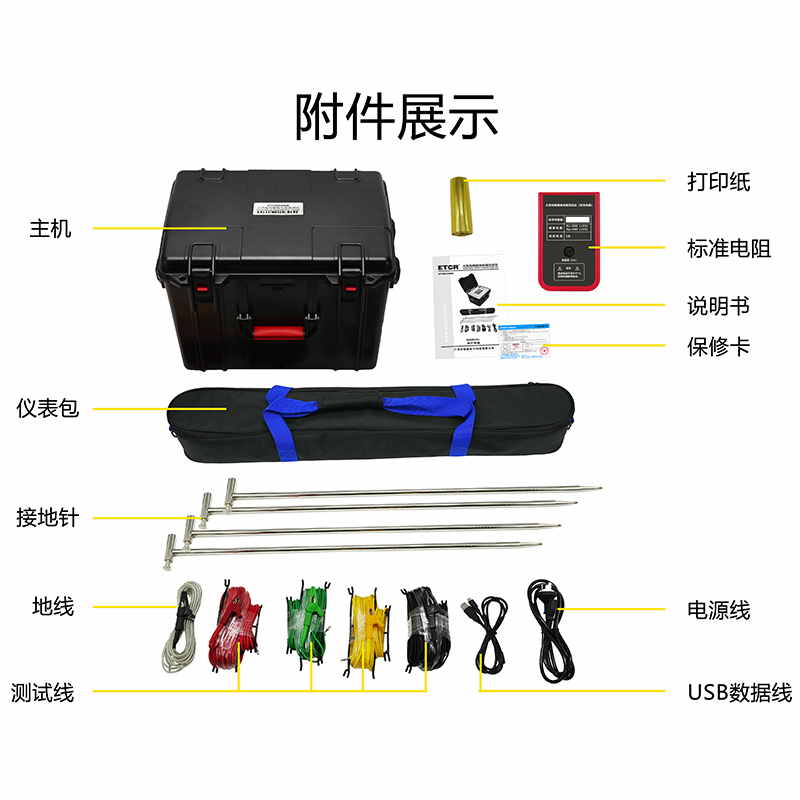 測量大型接地裝置接地電阻,接地導通,土壤電阻率,跨步電壓,接觸電壓,地表電位梯度等。