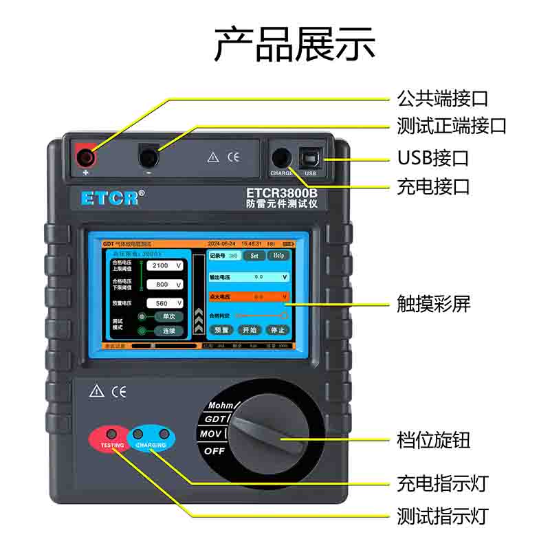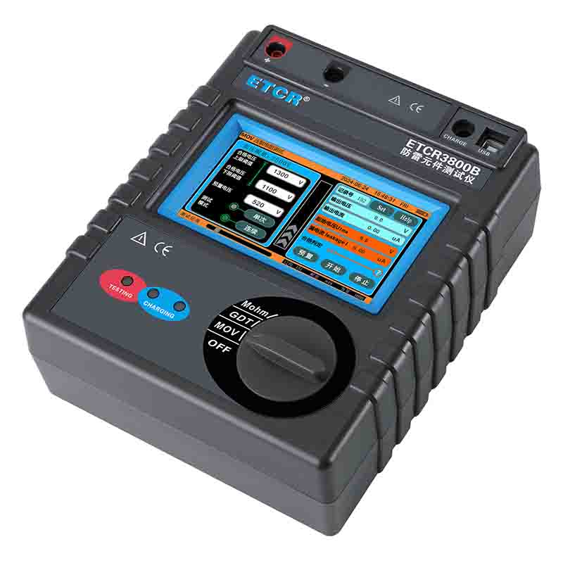 ETCR3800B智能型防雷元件測(cè)試儀又稱(chēng)防雷元件測(cè)試表、SPD現(xiàn)場(chǎng)測(cè)試儀、壓敏電阻測(cè)試儀、浪涌保護(hù)器測(cè)試儀,用于測(cè)量各種壓敏電阻(MOV)、氣體放電管(GDT)、浪涌保護(hù)器(SPD)性能參數(shù)測(cè)試,還具有絕緣電阻、吸收比、極化指數(shù)測(cè)試功能。儀表具有獨(dú)特的高壓短路保護(hù)、過(guò)流保護(hù)功能,專(zhuān)業(yè)級(jí)的參數(shù)設(shè)置功能、高壓限值設(shè)定、升壓速度設(shè)定、合格范圍設(shè)定、合格判斷篩選、自動(dòng)量程調(diào)節(jié)等功能。還具有單件測(cè)試模式、連續(xù)測(cè)試模式功能,特別適合批量元件測(cè)試。儀器廣泛用于避雷器、防雷器、浪涌保護(hù)器、壓敏電阻、金屬陶瓷放電管、真空避雷管等過(guò)壓防護(hù)元件性能參數(shù)的測(cè)試。是氣象防雷、電力、通信、機(jī)電安裝和維修、防雷元件生產(chǎn)廠家、以及工業(yè)企業(yè)部門(mén)常用必備的儀表。
