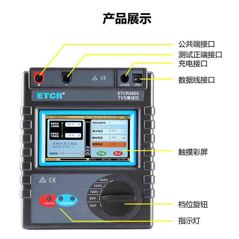 ETCR 3850瞬態抑制二極管測試儀又稱TVS測試儀,是專門針對TVS二極管性能指標測試而設計的,屬工業級測試儀器。瞬態抑制二極管和傳統的穩壓二極管相比具有更快的響應速度等優點,在電路設計中應用頗為廣泛,因此為了保證產品的性能,對出廠的每只二極管性能進行測試顯得尤為重要,在瞬態抑制二極管的性能指標中,其中最重要的指標就是“反向擊穿電壓”,本款產品就是針對這一指標檢測而設計的。