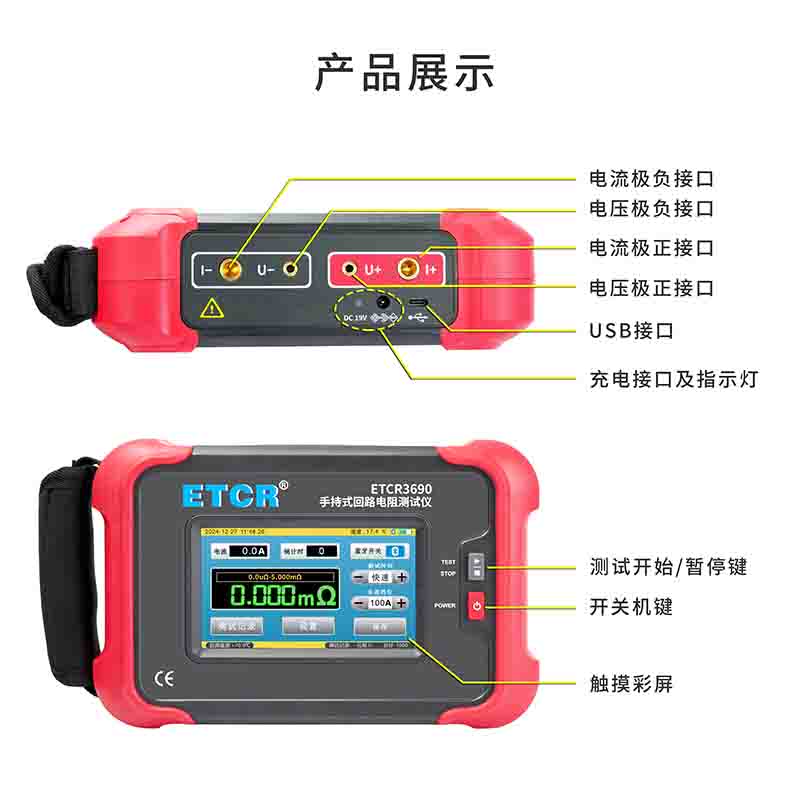 ETCR3690手持式回路電阻測試儀根據人體工程學原理設計,手感舒適,特殊設計的機體結構具有絕緣、封閉,防漏電、防風沙,減震防護等功能。儀表采用高亮度5寸觸摸彩屏,操作簡易快速功能直達,字符清晰明亮,中英文顯示界面。儀表有多檔測試電流可選,儀表顯示當前檔位的測試范圍,用戶可自行選擇電流檔位及測試時間,滿足用戶不同場合的要求。