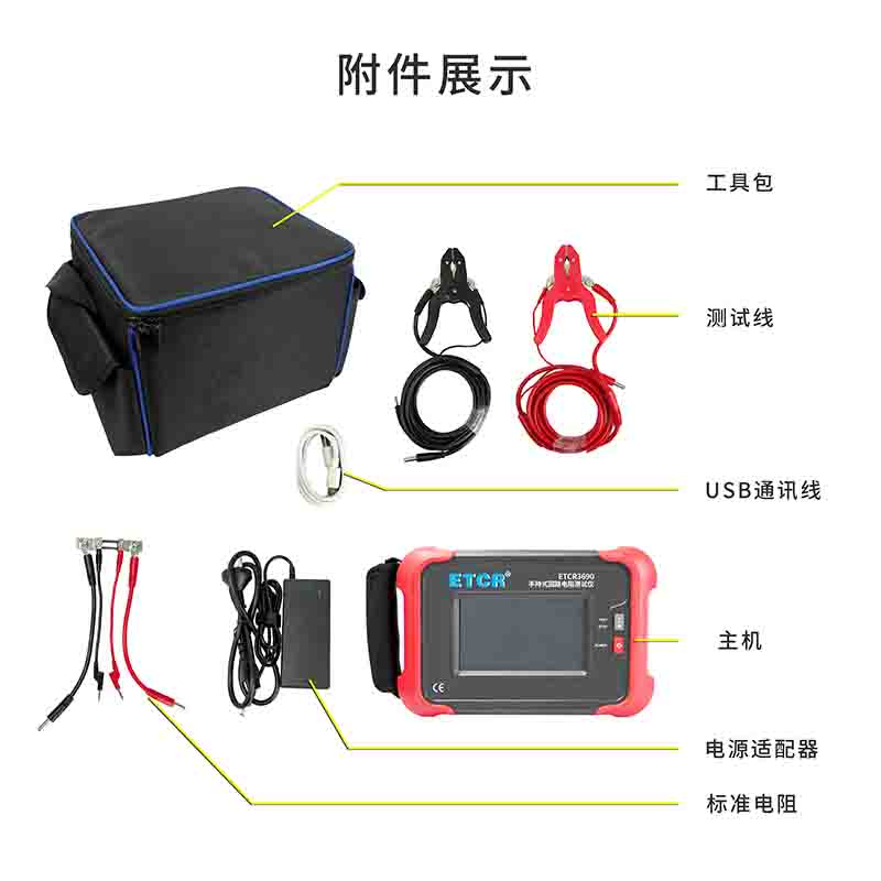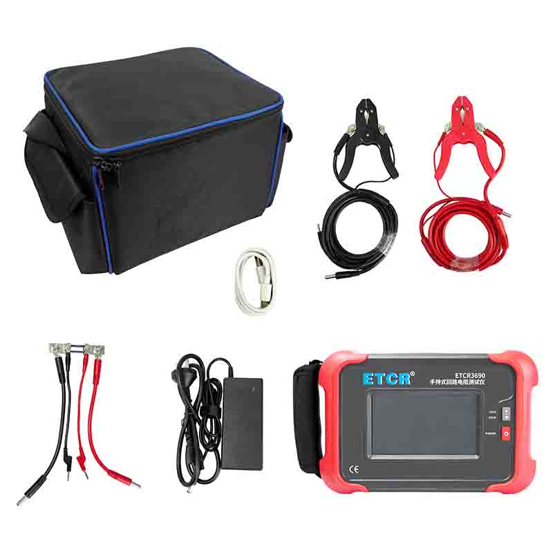 ETCR3690手持式回路電阻測試儀由主機、監控軟件、測試線、電源適配器、USB通訊線等組成。儀表可存儲測試1000組數據,用戶可通過藍牙通訊讀取數據記錄,也可通過USB接口及上位機軟件將數據記錄上傳電腦,進行歷史數據讀取、查閱、保存等功能。