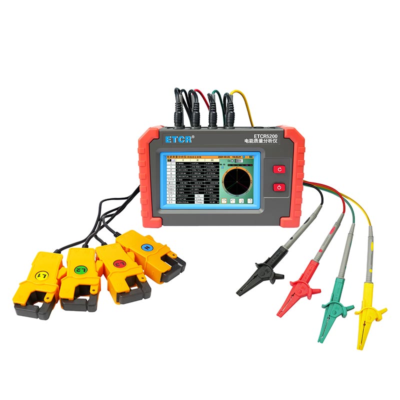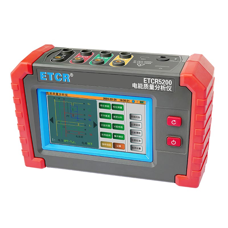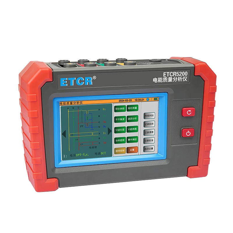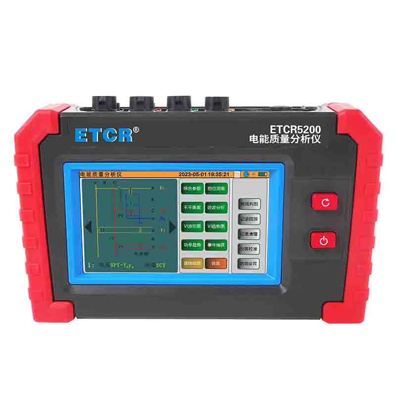 ETCR5200迷你型電能質量分析儀又稱電力質量分析儀、電力參數測試儀、諧波分析儀,是一款專為現場測試三相電能質量的高精度綜合型測試儀器。儀表具有智能化、功能完善、人機操作簡潔、中英文雙語操作界面等特點。儀表采用5寸觸摸彩屏、體積小重量輕、攜帶方便,可選配多款電流鉗。儀表可同時測量4路電流(ABC三相及中性線電流),3路電壓、三相不平衡度、有功功率、無功功率、視在功率、諧波比、總諧波失真度等;顯示電流電壓的實時波形、相量圖;動態捕捉電壓電流瞬時變化,監測啟動電流,監測各電力參數并生成告警列表,長時間記錄測試數據并生成趨勢曲線圖等功能。適用于電力、石化、冶金、鐵路、工礦企業、科研院校、計量部門等。