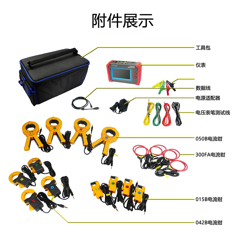 | 電流鉗規格(選配) | 015B電流鉗:17mm×18mm 042B電流鉗:Φ40mm 050B電流鉗:Φ50mm 200F柔性電流鉗:Φ200mm |