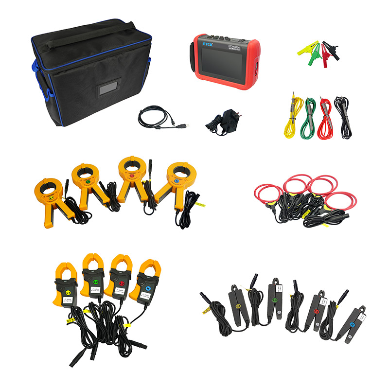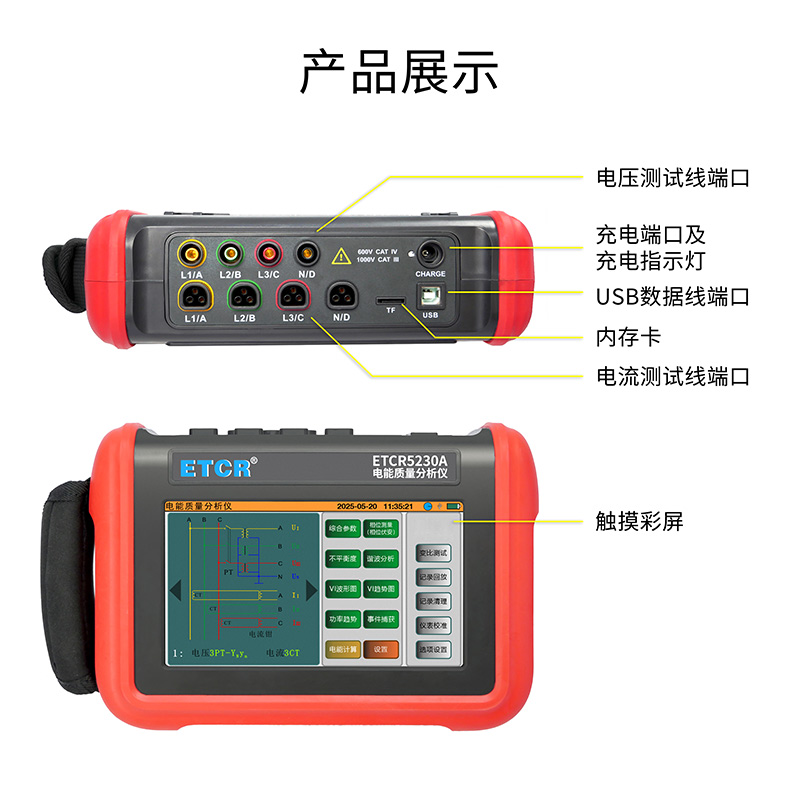 ETCR5230A電能質量分析儀是我公司精心研制的一款專為現場測試三相電能質量的高精度綜合型測試儀器。儀表具有智能化、功能完善、人機操作簡潔、中英文雙語操作界面等特點。儀表采用7寸觸摸彩屏、體積小重量輕、攜帶方便,可選配多款電流鉗。儀表可同時測量4路電流(ABC三相及中性線電流),3路電壓、三相不平衡度、有功功率、無功功率、視在功率、諧波比、總諧波失真度等;顯示電流電壓的實時波形、相量圖;動態(tài)捕捉電壓電流瞬時變化,監(jiān)測啟動電流,監(jiān)測各電力參數并生成告警列表,長時間記錄測試數據并生成趨勢曲線圖等功能。