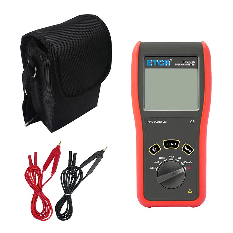 ETCR3630A便攜式毫歐計又稱直流低電阻計、直流電阻測試儀,歐姆計,儀表采用微處理機技術(shù),四線法測試,安全精密可靠。主要用于測量電纜的導(dǎo)線電阻,開關(guān)、接插件、繼電器的接觸電阻,線圈、電動機、變壓器繞組的直流低電阻,金屬鉚接件金屬構(gòu)件之間,地網(wǎng)地極連接導(dǎo)體間的聯(lián)接電阻。儀表廣泛應(yīng)用于工礦企業(yè)、建筑監(jiān)測監(jiān)理公司、建筑施工單位、防雷公司、電力部門、船舶機車廠等。ETCR3630A便攜式毫歐計由主機、測試線組成。主機大屏LCD顯示,一目了然。能存儲1000組數(shù)據(jù),電阻測量范圍:0.1mΩ~40.0kΩ,最大測試電流:100mA,儀表操作簡易,攜帶方便。