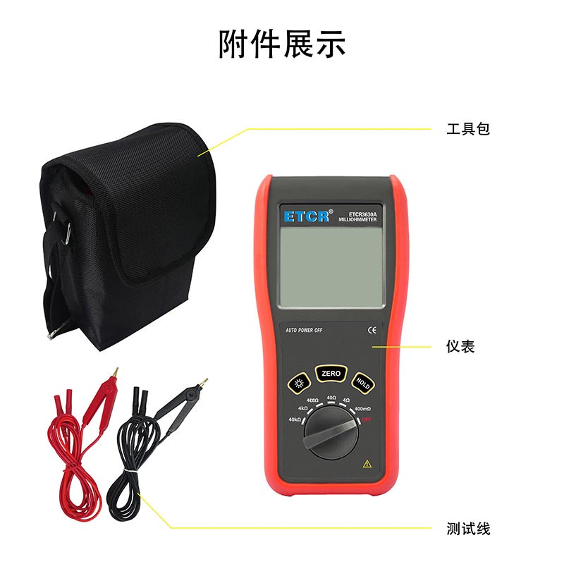 | ETCR3630A便攜式毫歐計 | 0.1mΩ~40kΩ | 0.1mΩ | 100mA | LCD屏 | 1000組 | 干電池 |