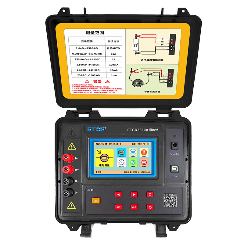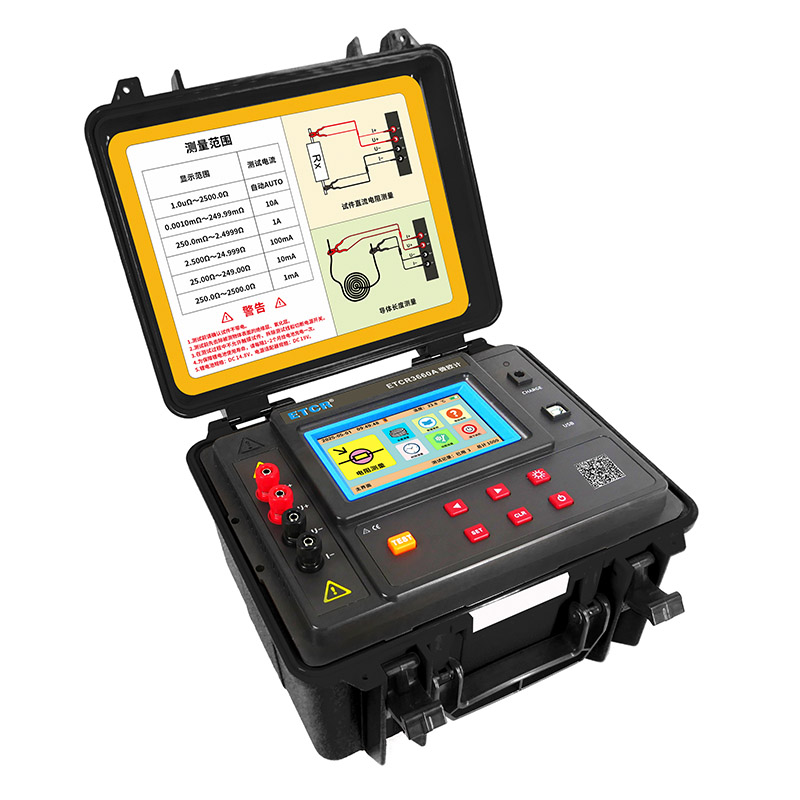 ETCR3660A微歐計又稱直流電阻測試儀、直流低值電阻測試儀,儀表采用微處理機技術,精密四線法測試,準確可靠。主要用于測量小型變壓器繞組電阻;接地導通電阻;電纜導線電阻;開關、接插件、繼電器的接觸電阻;金屬鉚接電阻;線圈、電動機、互感器繞組電阻;金屬構件之間聯結電阻;電焊接點電阻;蓄電池并聯連接電阻;以及導線長度測量計算等。儀表外殼采用防水保護箱,防撞、防摔、防水(防護等級IP65)堅固安全耐用,儀表還配有大容量可充電鋰電池組,特別適合在戶外工地使用。廣泛應用于建筑質檢站、監理公司、建筑施工單位、防雷公司、電力部門、船舶機車廠等。