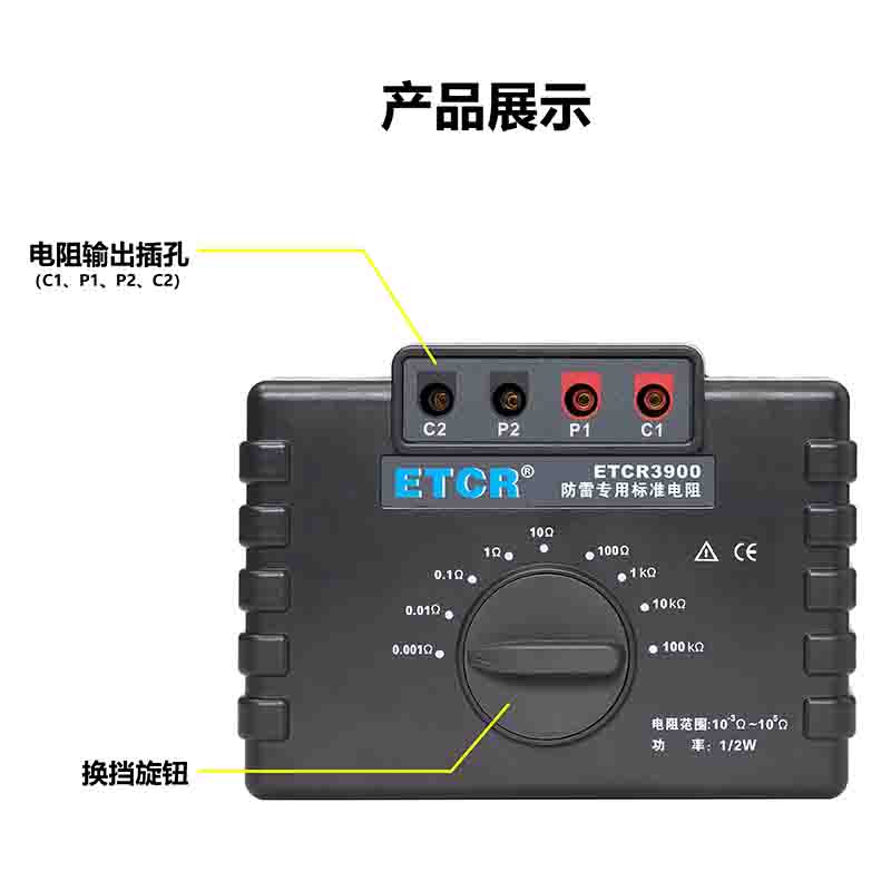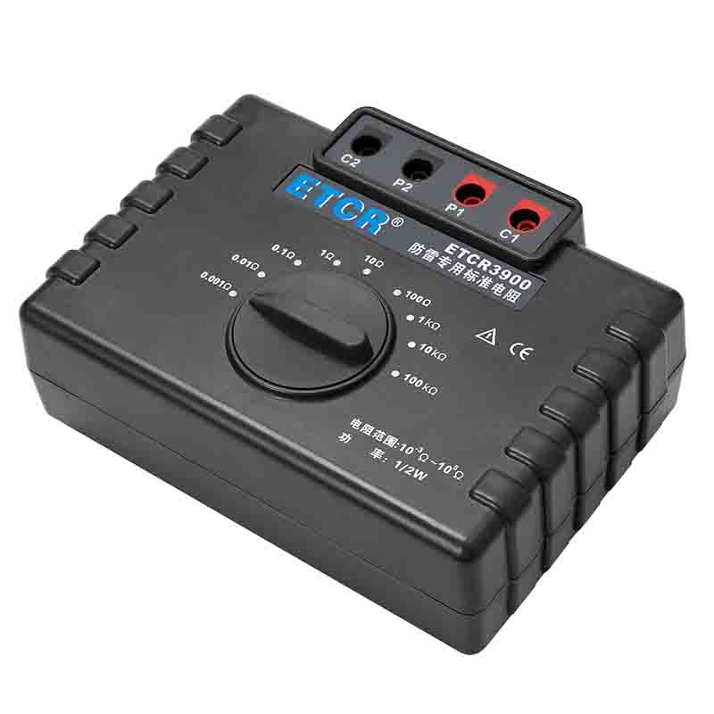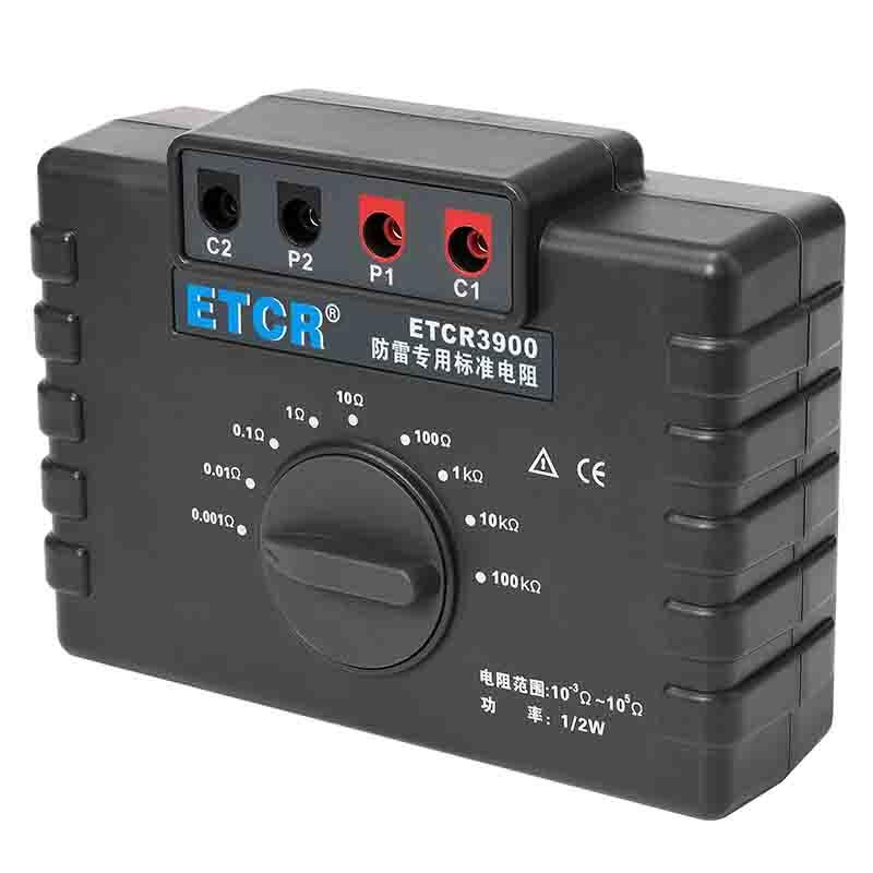 ETCR3900防雷專用標準電阻由9個1/2W高精度線繞電阻組成,校準電阻時直接換擋測試,無需更換測試線,性能穩定結構堅固,校準測試特別方便。采用的高精度線繞電阻最高精度達0.05%,其阻值包括1mΩ、10mΩ、100mΩ、1Ω、10Ω、100Ω、1kΩ、100kΩ完全滿足國家氣象局38號令【雷電防護裝置檢測資質管理辦法】中規定的10-3~105Ω范圍。本標準電阻主要用于接地電阻測試儀、等電位測試儀等儀器的校準。廣泛應用于建筑質檢站、監理公司、建筑施工單位、防雷公司、電力部門等。
