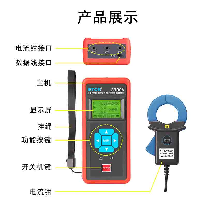 | ETCR8300三路鉗形漏電流記錄儀 | Φ30mm | AC 0.00mA~20A | 7天 | 1秒-99分鐘 | 20萬組 | 鋰電池 | 有 |