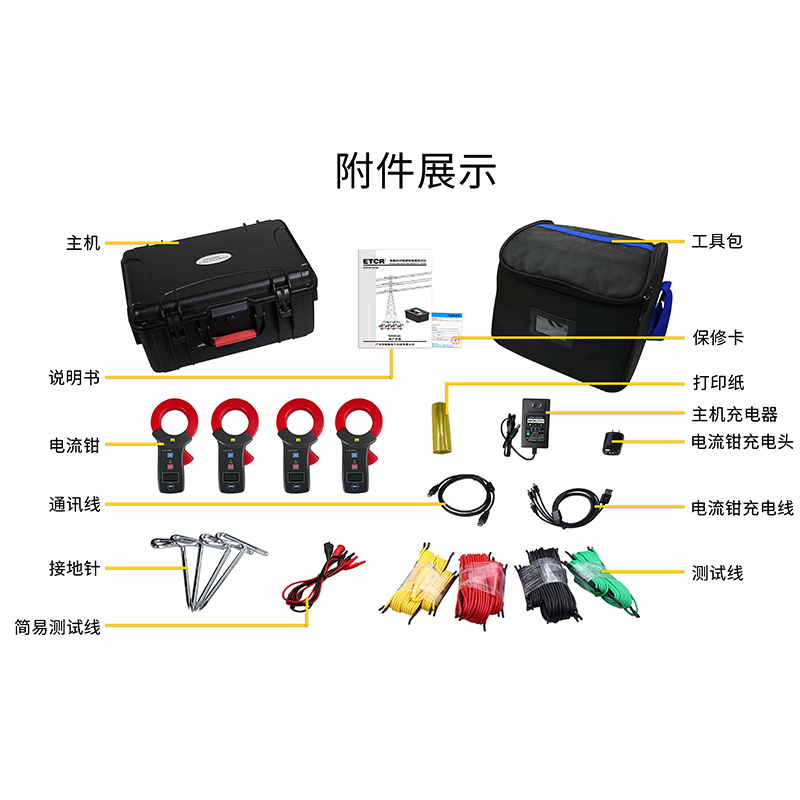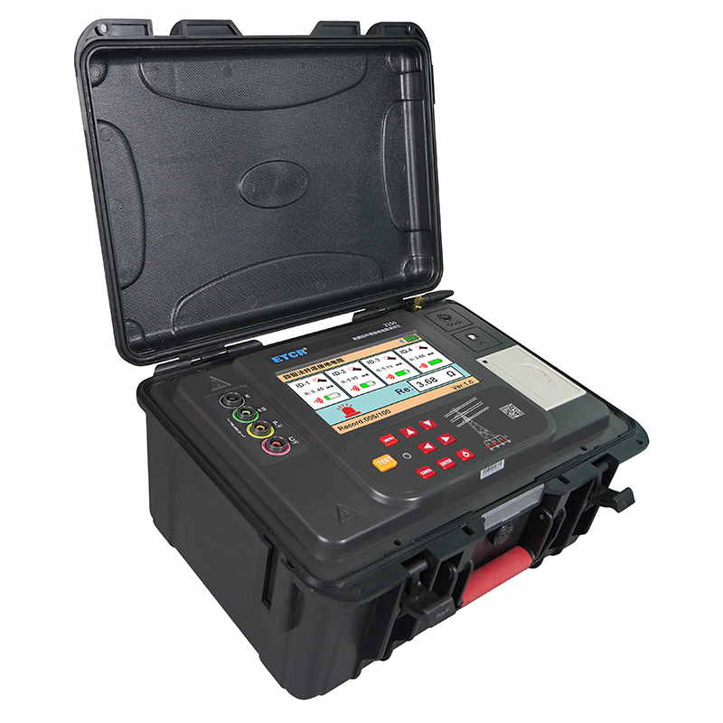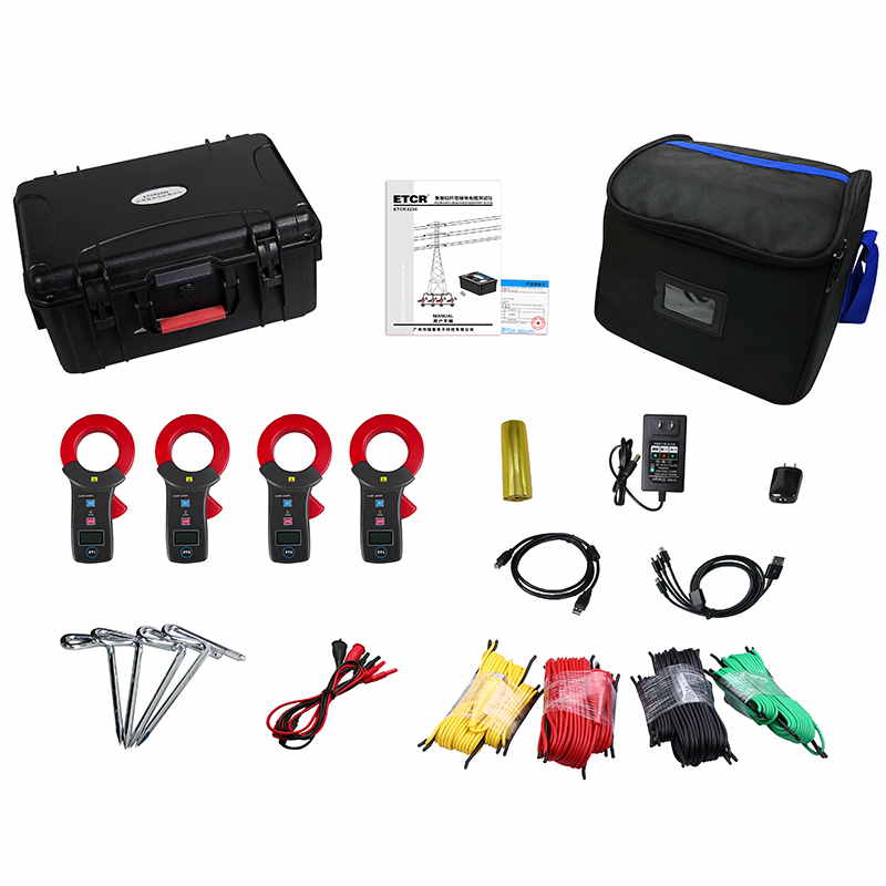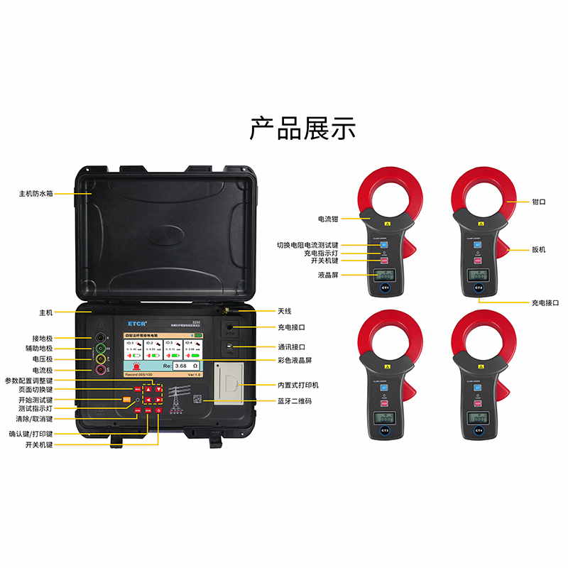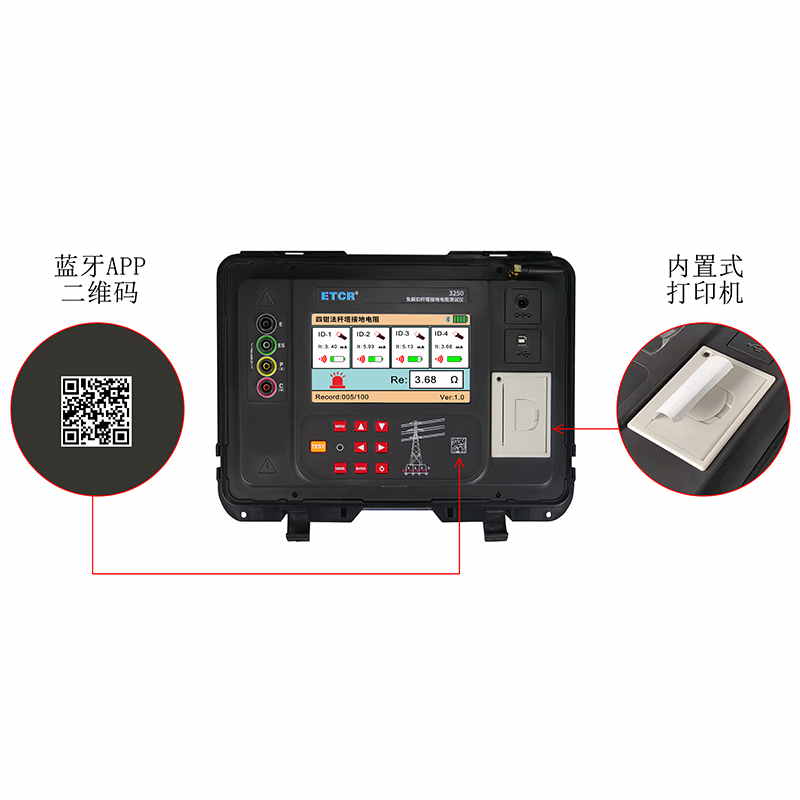 ETCR3250免解扣桿塔接地電阻測試儀由主機、4個電流鉗、測試線、輔助接地棒、通訊線、打印機等組成。主機采用7寸彩屏,電流鉗與主機采用無線通訊,儀表還具有藍牙通訊,下載APP后可在手機進行測試及查看測試結(jié)果。儀表配有內(nèi)置式打印機,可在現(xiàn)場打印測試結(jié)果。儀表能存儲100組數(shù)據(jù),通過USB接口及上位機軟件上傳測試結(jié)果,實現(xiàn)歷史數(shù)據(jù)讀取、查閱、保存、報表、打印等功能。儀表外殼采用防水保護箱,防撞、防摔、防水(防護等級IP65)堅固安全耐用,儀表還配有大容量可充電鋰電池組,特別適合在戶外工地使用。