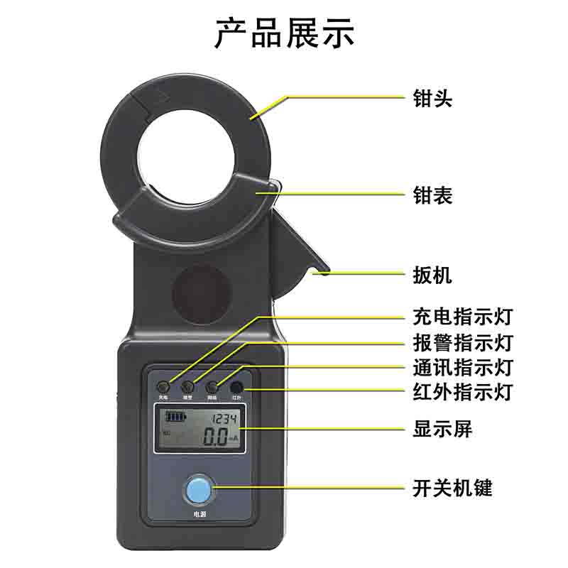 3、監測儀帶有液晶顯示屏(顯示:電流值、電池電量、監測儀編號、網絡信號強度)可做鉗形電流表使用,一機多用。