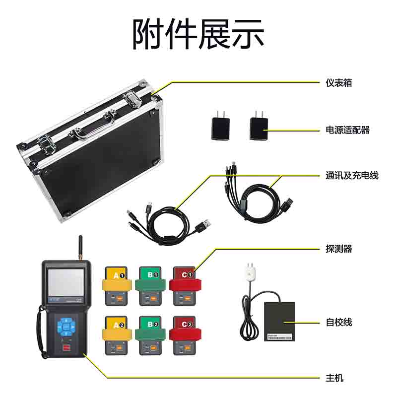 儀表質量 | 主機:約380g(含電池);探測器:約71g×6個(含電池);總質量:約2.57kg(含附件) |