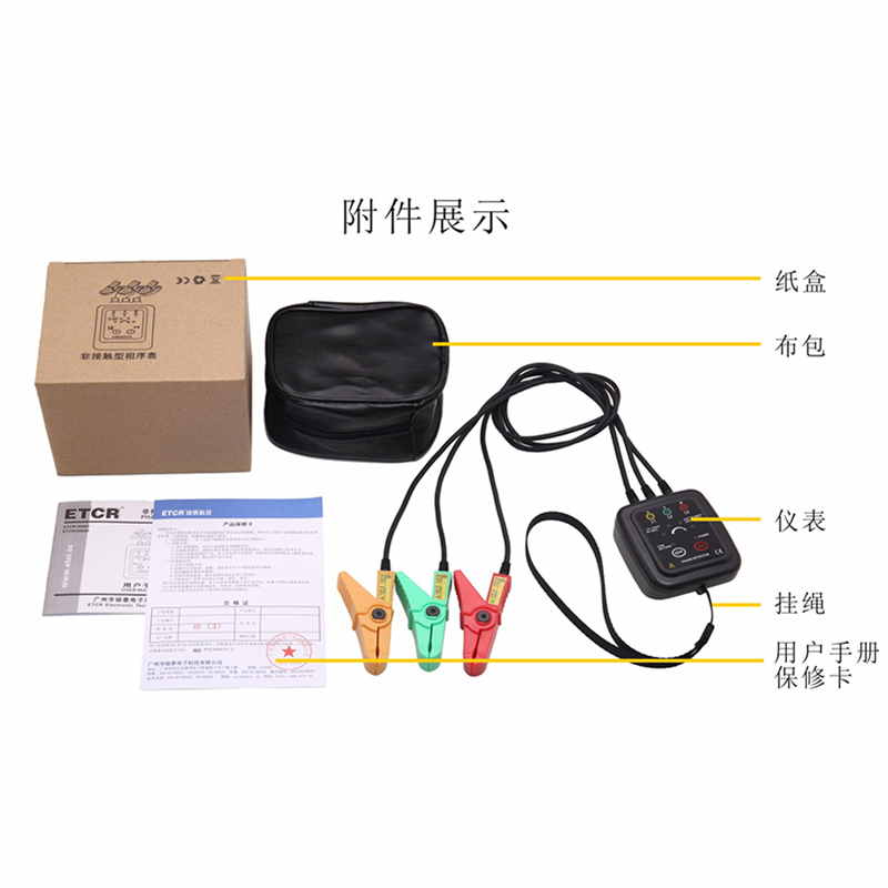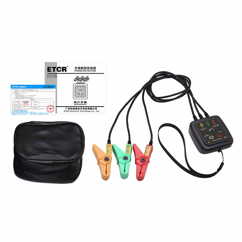 ETCR1000C非接觸型檢相器又稱非接觸相序表、相序檢測儀、電機三相檢測儀、相序測試儀、馬達轉向測試儀,用于相序檢測(正相、逆相、缺相)、活線檢查、簡易檢電、火線識別、缺相判斷、斷線位置查找、線路檢修。