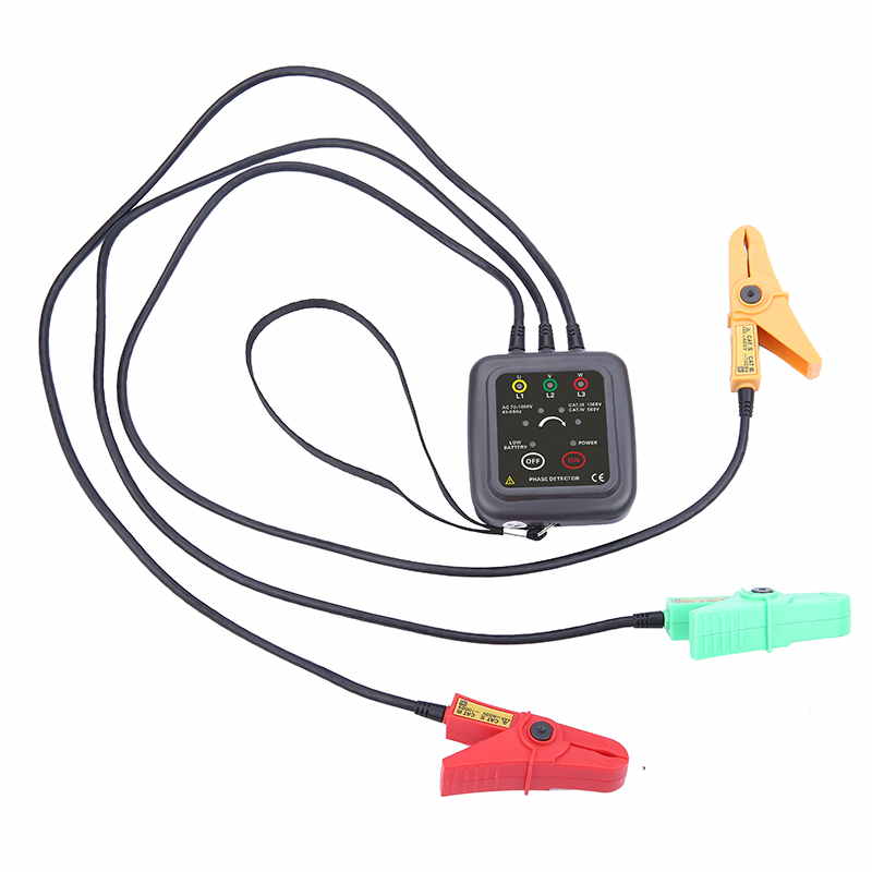 1、采用鉗形非接觸感應式測量,不用剝開電纜線外皮,無需接觸高壓裸露火線,直接將三個超感應高絕緣鉗夾分別夾住三相火線的絕緣外皮即可檢測相序。
