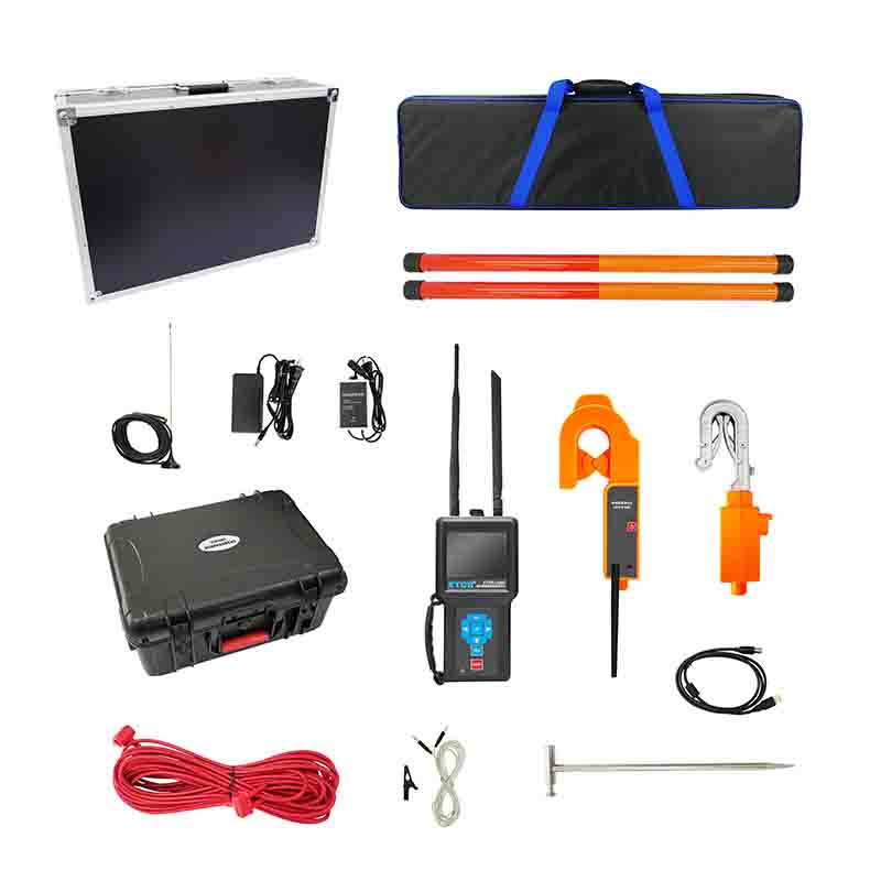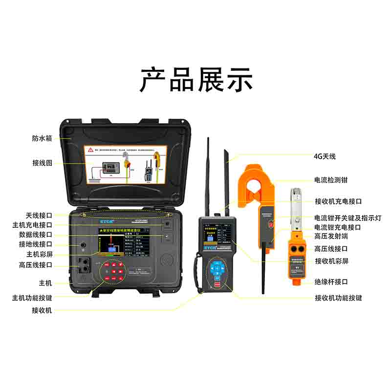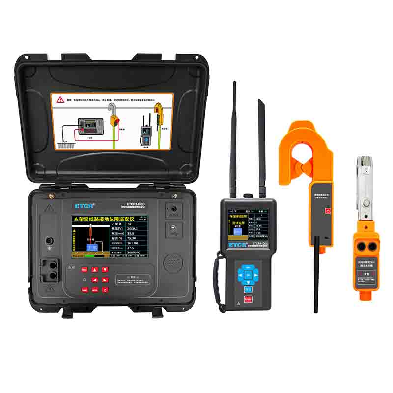 ETCR1400C架空線路接地故障巡查儀,由主機、電流檢測鉗、高壓發射端、接收機、測試線、接地針、絕緣桿及附件組成。主機與接收器之間為4G/LORA雙模通信,控制高壓信號輸出,同時將測試結果發出到主機。電流鉗與接收器之間為LORA通信,將電流鉗檢測到的信號發送到接收器。主機采用7寸彩屏,故障指向清晰明了,測試結果一目了然,接收機具有語音播報功能,測試結果、線路故障方向,使得現場操作更加輕松。電流檢測鉗及高壓發射端結構緊湊,體積小,重量輕,掛裝方便,一次掛裝即可完成線路故障查找,操作簡易快速,極大減輕了測試的工作強度,提高工作效率。