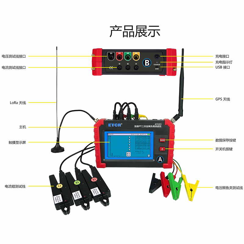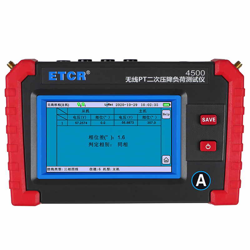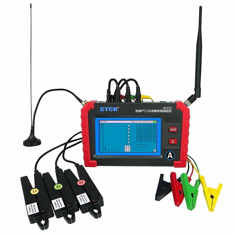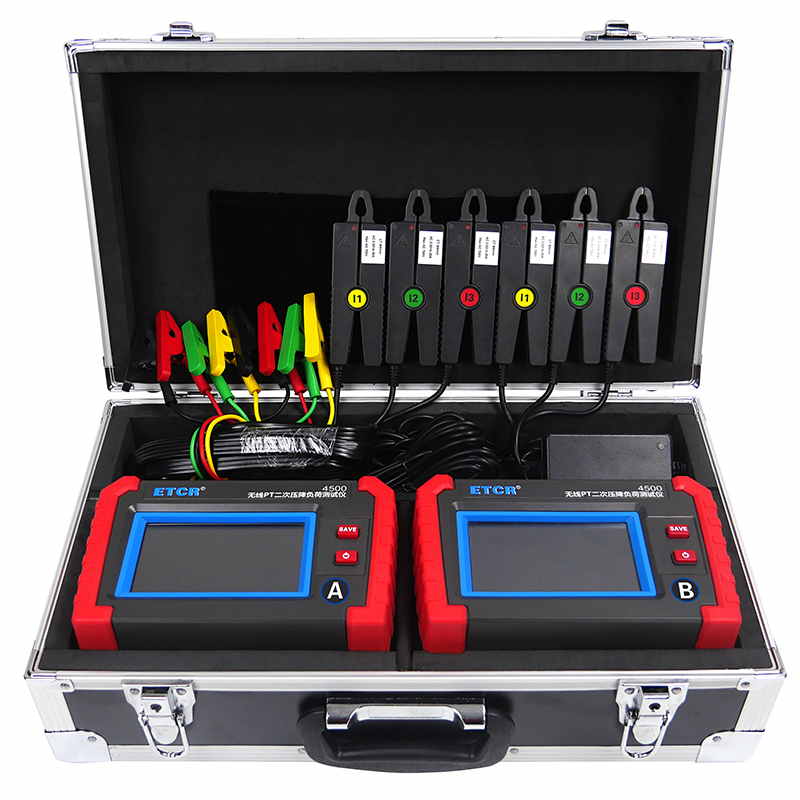 ETCR4500無線PT壓降負荷測試儀又稱PT核相儀、PT負荷測試儀、PT比差測試儀,用于現場在線測試電能計量裝置電壓互感器(以下簡稱 PT)的二次回路壓降,以及PT核相、PT負荷測試、CT負荷測試、三相伏安表、諧波分析等。儀表由2臺手持終端、6個電流鉗、2組電壓測試線等組成,2臺手持終端具有無線通訊及GPS通訊,可互設為主機或從機,實現同步測量變電站內不同位置之間電流、電壓、相位等參數。