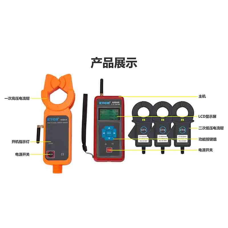 ETCR9500C-030無線高壓CT變比測試儀由一次電流鉗(高壓檢測儀)、二次電流鉗(3個)、主機、高壓絕緣桿、監控軟件、通訊線等組成,高壓電流鉗采用高性能坡莫合金制作,測試精度高。高壓電流鉗具有獨特的自動插拔結構,通過按壓或退拔絕緣桿能方便鉗夾或撤離被測導線,操作安全省時快捷,絕緣桿輕便,具有防潮﹑耐高溫﹑抗沖擊﹑抗彎﹑高絕緣特點,絕緣等級110kV。儀表具有存儲功能,USB通信接口,存儲數據可上傳電腦進行歷史數據讀取、查閱、保存、打印等。